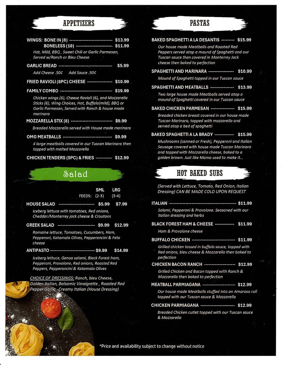 Chicken wings (6), Cheese Ravioli (6), and Mozzarella Sticks (6). Wing Choices, Hot, Buffalo(mild), BBQ or Garlic parmesan. Served with Ranch & house made marinara